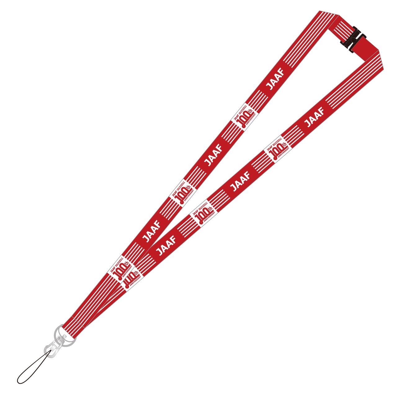 陸連100周年記念ロゴを配したネックストラップです。 【サイズ】片面約450mm(テープ部分) 【素材】ポリエステル 【原産国】日本 【カラー】赤
